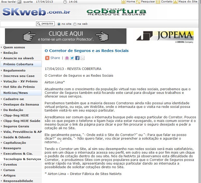 Bem-vindo à nossa página dedicada à presença da Netarts na mídia, onde destacamos a visibilidade e reconhecimento da nossa empresa nos principais meios de comunicação do mercado de seguros. Ao longo de nossa jornada, temos sido destaque em diversas plataformas renomadas, consolidando nossa posição como uma referência no setor. Explore esta seção para conhecer as notícias, entrevistas e artigos que ressaltam nosso compromisso com a excelência e inovação no universo dos serviços de seguros. Acompanhe-nos nesta trajetória de sucesso, refletida na cobertura midiática que reforça a nossa presença e impacto no mercado.